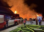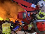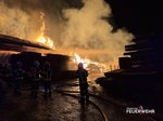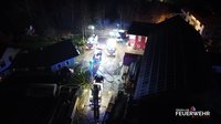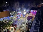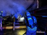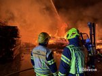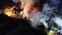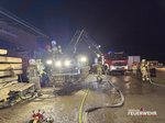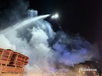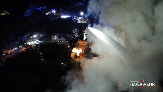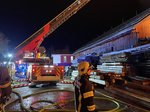 Nach rund fünf Stunden konnte der Einsatz der Drehleiter beendet werden. Das Atemschutzfahrzeug verbleibt vor Ort und stellt die Versorgung der eingesetzten Atemschutztrupps sicher. Die leeren Atemluftflaschen werden direkt an der Einsatzstelle wieder aufgefüllt, sodass die Feuerwehrkräfte unter Atemschutz weiterarbeiten können. Die Nachlöscharbeiten gestalten sich aufgrund der Größe des Brandobjekts und der noch vorhandenen Glutnester aufwendig und werden voraussichtlich noch mehrere Stunden andauern.
