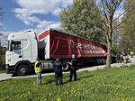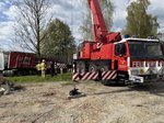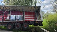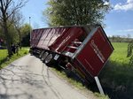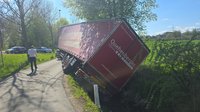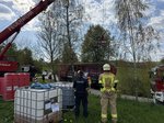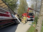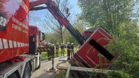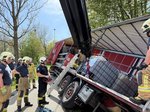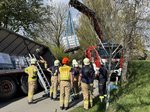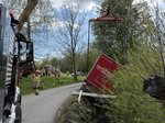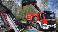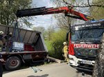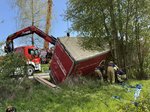 Ein LKW-Fahrer kam trotz LKW-Fahrverbots in einer engen Kurve von der Fahrbahn ab, wobei der Auflieger über die Böschung in einen Bach rutschte. Der Auflieger war zum Unfallzeitpunkt voll beladen. Zur Durchführung der Bergungsarbeiten wurde der Auflieger mittels Ladekran des Wechselladerfahrzeuges teilweise entladen, um das Gewicht zu reduzieren. Anschließend konnte der Auflieger mit dem Kran angehoben und wieder auf der Fahrbahn abgesetzt werden.