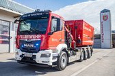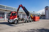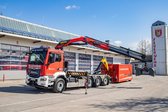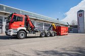 Der Abrollkipper, ebenfalls von der Firma Palfinger, ist mit einem Schub- und Knickarm ausgestattet, der eine größtmögliche Flexibilität bei der Aufnahme verschiedener Containerarten ermöglicht.