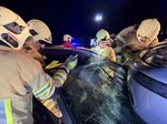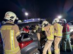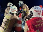 Die Übungsannahme war, ein schwerer Verkehrsunfall mit zwei Pkw und mehreren eingeklemmten Personen. Bei der Lageerkundung wurden durch den Übungsleiter drei eingeklemmte und zwei eingeschlossene Personen festgestellt. Die Mannschaft stabilisierte das silberne Fahrzeug mittels Spanngurten und Holzklötzen, um ein Abrutschen bzw. Abstürzen zu verhindern. Die Rettung der zwei eingeschlossenen Personen erfolgte im Anschluss durch die Fahrertür. Parallel dazu wurde mit der Rettungsaktion der drei eingeklemmten Personen im zweiten PKW begonnen. Um die Personen zu befreien, mussten alle Türen und das Dach des Fahrzeugs entfernt werden. Während der Rettungsaktion wurden die Verletzten durch geschulte Kameraden betreut.
