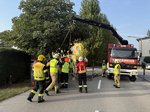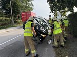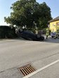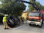 Ein PKW kollidierte aus bislang ungeklärter Ursache mit einem Stein und einem Baum und kam schließlich auf dem Dach zum Liegen. Bei Eintreffen der ersten Einsatzkräfte wurde der Fahrer bereits vom Roten Kreuz betreut und konnte den Unfall ohne gesundheitliche Schäden überstehen. Nach der Unfallaufnahme durch die Polizei wurde die Bergung des Fahrzeugs eingeleitet. Zunächst wurde das Fahrzeug mit dem Ladekran des Wechselladefahrzeugs aufgrund von Platzmangel auf die Seite gehoben und anschließend mithilfe von manuellen Kräften auf die Reifen gestellt. Nachdem das Unfallfahrzeug auf einen Parkplatz verbracht und die Straße gereinigt worden war, konnte der PKW durch ein Abschleppunternehmen abgeschleppt werden. Damit war der Einsatz der Feuerwehr beendet.