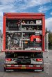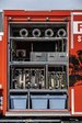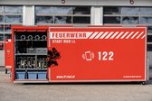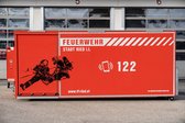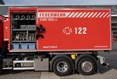 In den seitlichen Geräteraum sind die wasserführenden Armaturen, Schläuche, Beleuchtungs- und Absperrmaterial sowie ein Be- und Entlüftungsgerät gehaltert. Da dieses Fahrzeug bei überörtlichen Einsätzen der Drehleiter ebenfalls mit zur Einsatzstelle ausrückt, wurden auch zwei Atemschutzgeräte im Container gelagert. Am Dach des Containers befindet sich noch ein Wasserwerfer.