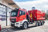 Der Abrollkipper, ebenfalls von der Firma Palfinger, ist mit einem Schub- und Knickarm ausgestattet, der eine größtmögliche Flexibilität bei der Aufnahme verschiedener Containerarten ermöglicht.